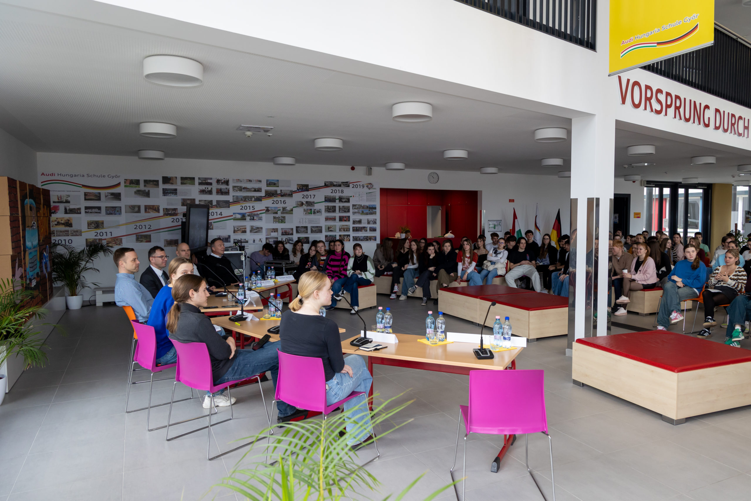 An der Audi Akademie Hungaria Győr standen Vorträge und Experimente zu den Themen Energiewirtschaft und Biodiversität sowie ein Besuch im Audi Hungaria-Werk auf dem Programm. Die Széchenyi István Universität Győr lud zum Besuch der Audi Hungaria-Lehrstühle für Gesamtfahrzeugentwicklung sowie Antriebstechnologie ein. Am letzten Tag der ereignisreichen Projektwoche luden die Schüler vier Experten von der Universität und von Audi Hungaria zu einer Podiumsdiskussion mit dem Thema Mobilität der Zukunft ein. Die Schüler stellten eine Reihe von interessanten und auch kritischen Fragen, die von den Fachleuten bereitwillig beantwortet wurden. Dabei ging es hauptsächlich um den Umstieg von Fahrzeugen mit Verbrennungsmotor auf elektrisch betriebene Autos. Die Experten beleuchteten das Thema aus verschiedenen Blickwinkeln, wobei sie auch die besonderen Herausforderungen anschnitten. Das gemeinsame Fazit aber fiel bei allen gleich aus: Bei der Mobilität der Zukunft handelt es sich um einen äußerst komplexen Themenkreis, bei dem nicht nur die technische Umsetzung im Fokus steht, sondern auch Aspekte wie zum Beispiel Energieversorgung, Städteplanung sowie die Ansprüche der modernen Gesellschaft in Betracht gezogen werden müssen. Die Begegnungswoche im Rahmen der Partnerschaft mit der Liebfrauenschule aus Bonn war insgesamt eine sehr erfolgreiche Zusammenarbeit der Audi Hungaria Deutsche Schule Győr und außerschulischer Partner der Region mit dem Ziel, hochaktuelle Entwicklungen zu verfolgen und damit das Interesse der nachwachsenden Generation für Ingenieursstudiengänge zu wecken, die die Gestaltung unserer Zukunft nachhaltig beeinflussen werden.