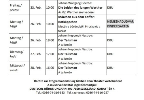HIER haben wir schon mehr über das deutschsprachige Theater in Szekszárd geschrieben. Was kann man sich aber jetzt in der letzten Woche vom Februar im Theater Deutsche Bühne Ungarn anschauen?