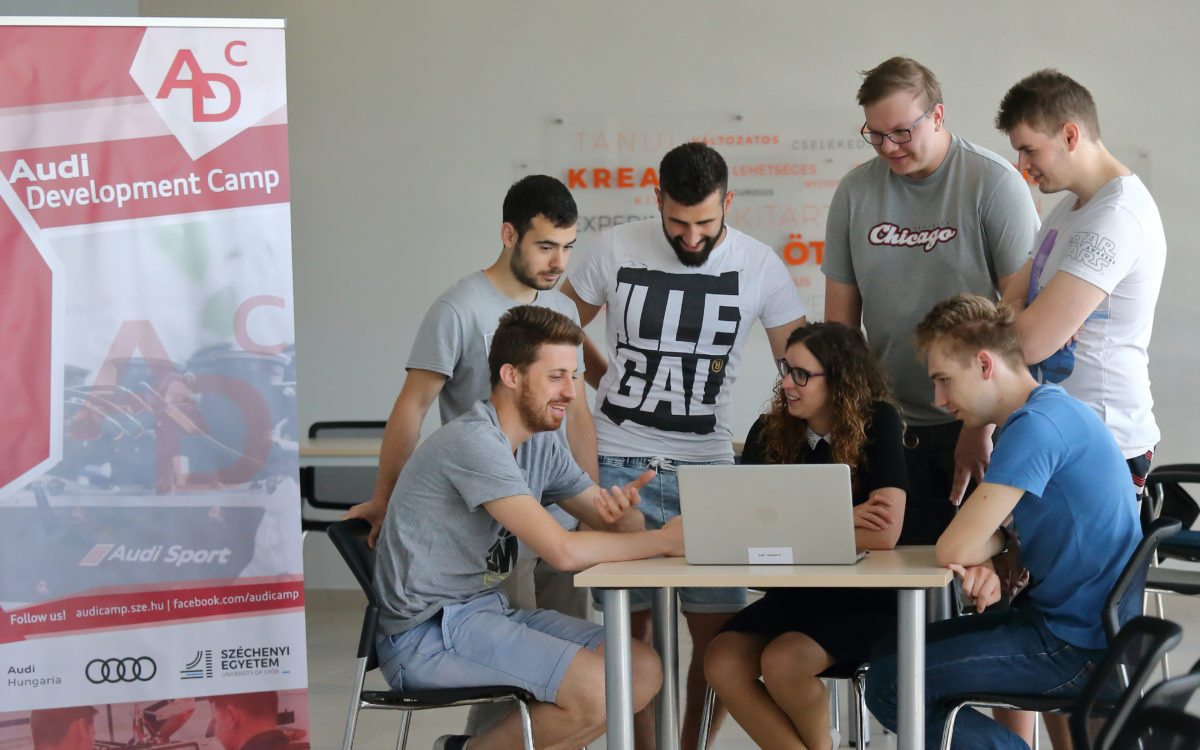 A Széchenyi István Egyetemen 17 mérnökhallgató vesz részt a Development Camp elnevezésű négyhetes nyári szakmai programon, ahol a közelmúltban átadott Management Campus épületében az Audi Hungaria által kiadott műszaki projektfeladatokon, hibrid meghajtási rendszerek fejlesztésén és szimulációján dolgoznak négy nemzetközi csapatot alkotva. A tábor célja a hallgatók kompetenciáinak bővítése a komplex problémamegoldás területén, mindez versenyszerű, játékos, de egyben nagyon intenzív formában.