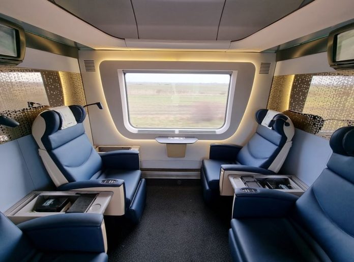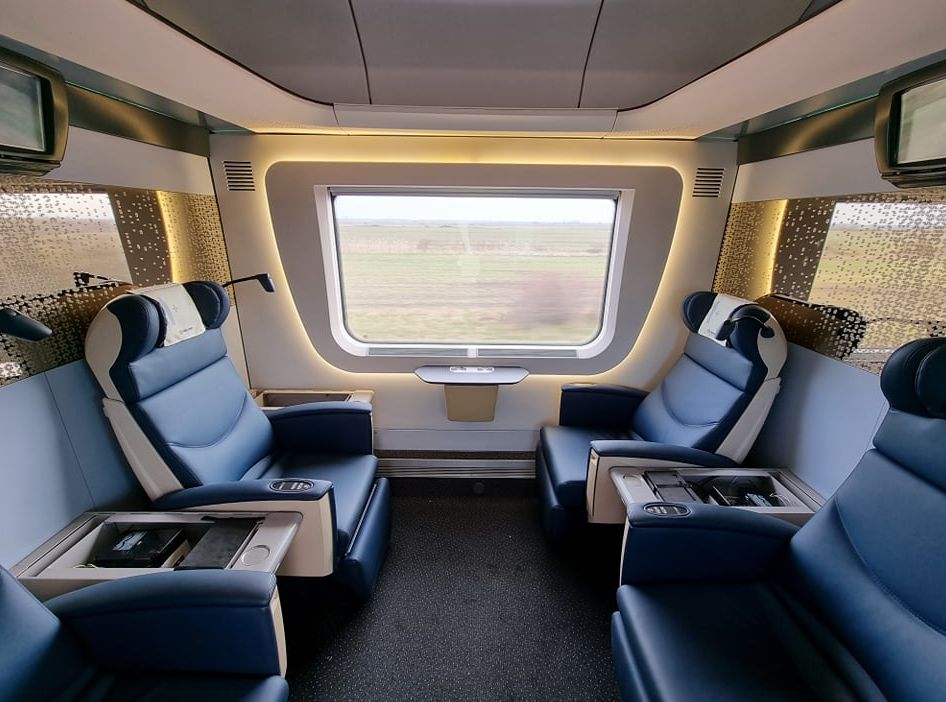 Die neue Business-Zugklasse der MÀV wird derzeit getestet. Erste Waggons der IC + Familie sind am Start. Derzeit noch im Testlauf unterwegs, werden die Wagen im Sommer den Passagieren vorgestellt. Die exklusive Kabine der 1+ Klasse ist mit vier Ledersitzen ausgestattet stellt die besondere 1. Klasse dar und hat zahlreiche Extras. Viel Platz, Ruhe und luxuriöses Ambiente.