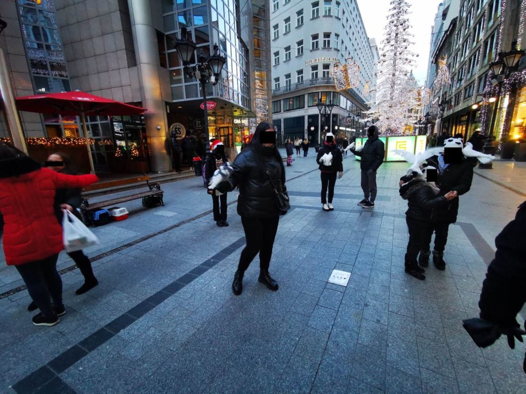Unser Team hat sich das Ganze einen Moment lang angesehen und ist selbst in die Verhandlung gegangen, man bemerkte die Kamera und Fotos die erstellt wurden um das Geschehen zu dokumentieren und wurde schnell sehr böse, man drohte mit Schlagabtausch und man forderte das Fotomaterial. Ein Anruf bei der Polizei liess die Bande dann schnell in den Rückzug gehen. Die Tauben schnell in Transportkisten verpackt und weiter geht es in die nächste Strasse wo wieder ahnungslose Passanten mit dem „Tauben-Überfall“ überrascht werden. Das Ordnungsamt läuft mehrmals an dem Geschehen vorbei und ignoriert die Situation. Hier möchte keiner eine unangenehme Situation herausfordern und ignoriert daher besser. Eine Anfrage beim Ordnungsamt und der Polizei bleibt unbeantwortet.