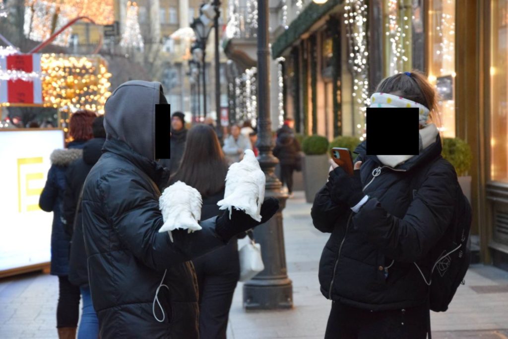 Sie treiben ihr Unwesen auf Budapests Prachtstrasse oder anderen Plätzen an denen viel Publikumsverkehr, speziell auch Touristen unterwegs sind… Mehrere Personen mit jeweils ein bzw. zwei Tauben auf dem Arm ziehen dabei durch die Besucherströme und platzieren völlig unerwartet eine Taube auf der Schulter von Kindern oder aber auch von Erwachsenen, manchmal sogar auf dem Kopf der Passanten…Sieht im ersten Moment vielleicht ganz witzig aus und viele Eltern zücken ihr Handy und machen schnell den Schnappschuss, danach werden sie aufgefordert weitere Fotos in Ruhe zu machen, es folgt ein regelrechtes Fotoshooting. Dann kommt plötzlich das Abschlussfoto und nun heisst es Zahltag, denn das Shooting war natürlich nicht kostenlos…Ziemlich frech und hart werden dann utopische Preise veranschlagt und schnell kommen weitere Personen ins Spiel die plötzlich bei den Verhandlungen mitmischen. Die Besucher/Passanten sind dann meistens überfordert und zahlen schliesslich eine Summe über die man sich einigt. Übrigens ganz dreist: Wer kein Bargeld dabei hat wird sofort per Bankkarte zur Kasse gebeten, man ist bestens ausgerüstet.