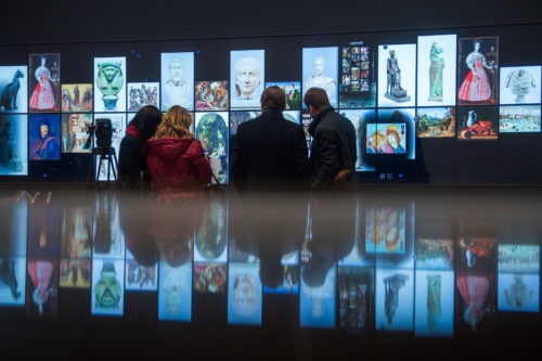 A világ legnagyobb, érintõképernyõs múzeumi LCD falát nézik érdeklõdõk a Szépmûvészeti Múzeum Márvány csarnokában az eszköz átadásának napján, 2019. január 22-én. A 15 méter hosszú múzeumi fal csaknem 300 mûtárgy adatait jeleníti meg interaktív módon.