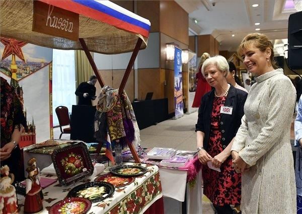 Wie schon in den sechs letzten Jahren gab es auch 2017 einen „Diplomatenmarkt“. An 20 Ständen im Hotel InterContinental präsentierten Gastländer typische Essen und Getränke. Angeboten wurden auch kleine Geschenke und Besonderheiten aus der jeweiligen Heimat. Der Erlös wird Kinderstiftungen und Krankenhäusern zu Gute kommen. Auf dem Bild besichtigt die Anita Herczegh, die Ehefrau des ungarischen Präsidenten János Áder, zusammen mit Bridget Claire Lindsay, Ehefrau des britischen Botschafters, den russischen Stand.