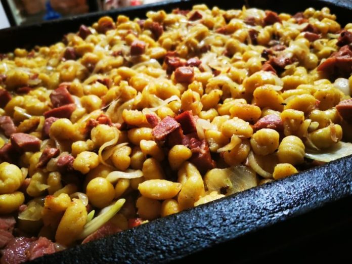 Der kulinarische Duft auf ungarns Weihnachtsmärkten ist vielfältig und gut. Duftend und sehr gefragt derzeit auch Dödölle. Die regionale Köstlichkeit aus der Zala Region ist bereits auf vielen Weihnachts- und Adventsevents zu finden. Eigentlich sagt man, es sei ein Gericht für die Armen. Eine Masse aus gekneteten Kartoffeln, die in kleine Stücke in einer großen Pfanne zusammen mit Zwiebeln und Speck gebraten werden. Serviert wird das Ganze mit Sauerrahm und fertig ist das Dödölle Gericht.