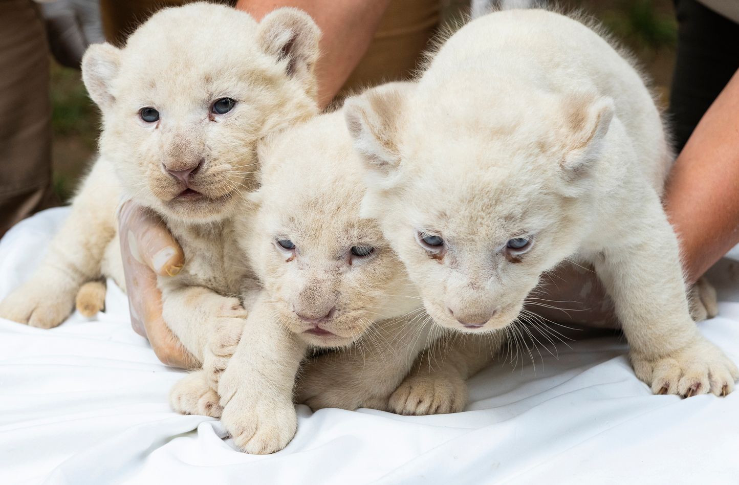 Nachwuchsneuigkeiten aus dem Zoo in Nyíregyháza: Gleich drei weibliche weiße Löwenbabys (Panthera leo krugeri), sind dort geboren. Das Licht der Welt erblickten sie bereits vor vier Wochen im Zoo von Nyíregyháza. Jetzt hat man sie heute öffentlich präsentiert. Jetzt dürfen sie mit ihrer Mama auf Erkundungstour gehen.