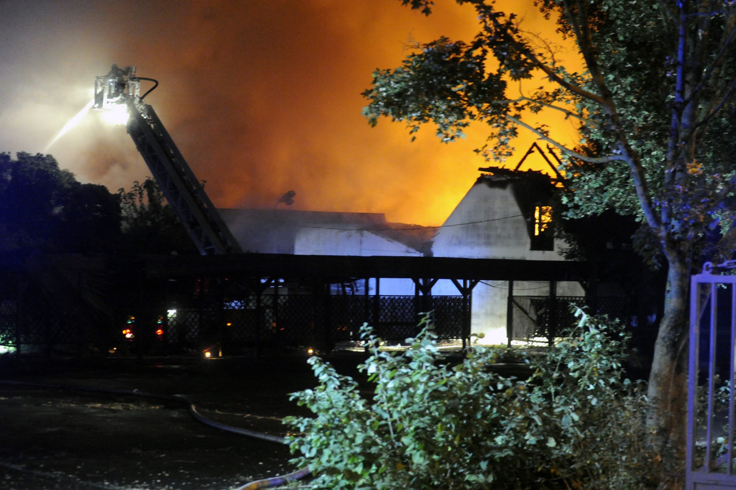 Ég az egykori Hûvösvölgyi Vigadó 2018. szeptember 18-ára virradó éjjel. Az épület kiégett, tetõszerkezete részlegesen beomlott.