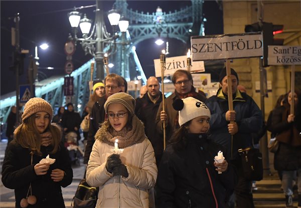 Épp ezért a háború sújtotta országok névtábláival vonulnak a Sant‘ Egidio (Szent Egyed) közösség és a Fiatalok a Békéért mozgalom fáklyás békemenetének résztvevői a fővárosi Fővám téren 2018. január 1-jén.