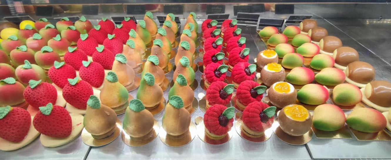 Das Innere der Desserts birgt eine ebenso raffinierte Überraschung: luftiger Biskuit und feine Cremes bilden die Grundlage. Dabei wird auch der Geschmack mit der äußeren Form in Einklang gebracht – so findet man im zitronenförmigen Dessert eine erfrischend-zitronige Creme, während das pfirsichförmige Pendant aus fruchtigem Biskuit und Pfirsichmousse besteht.