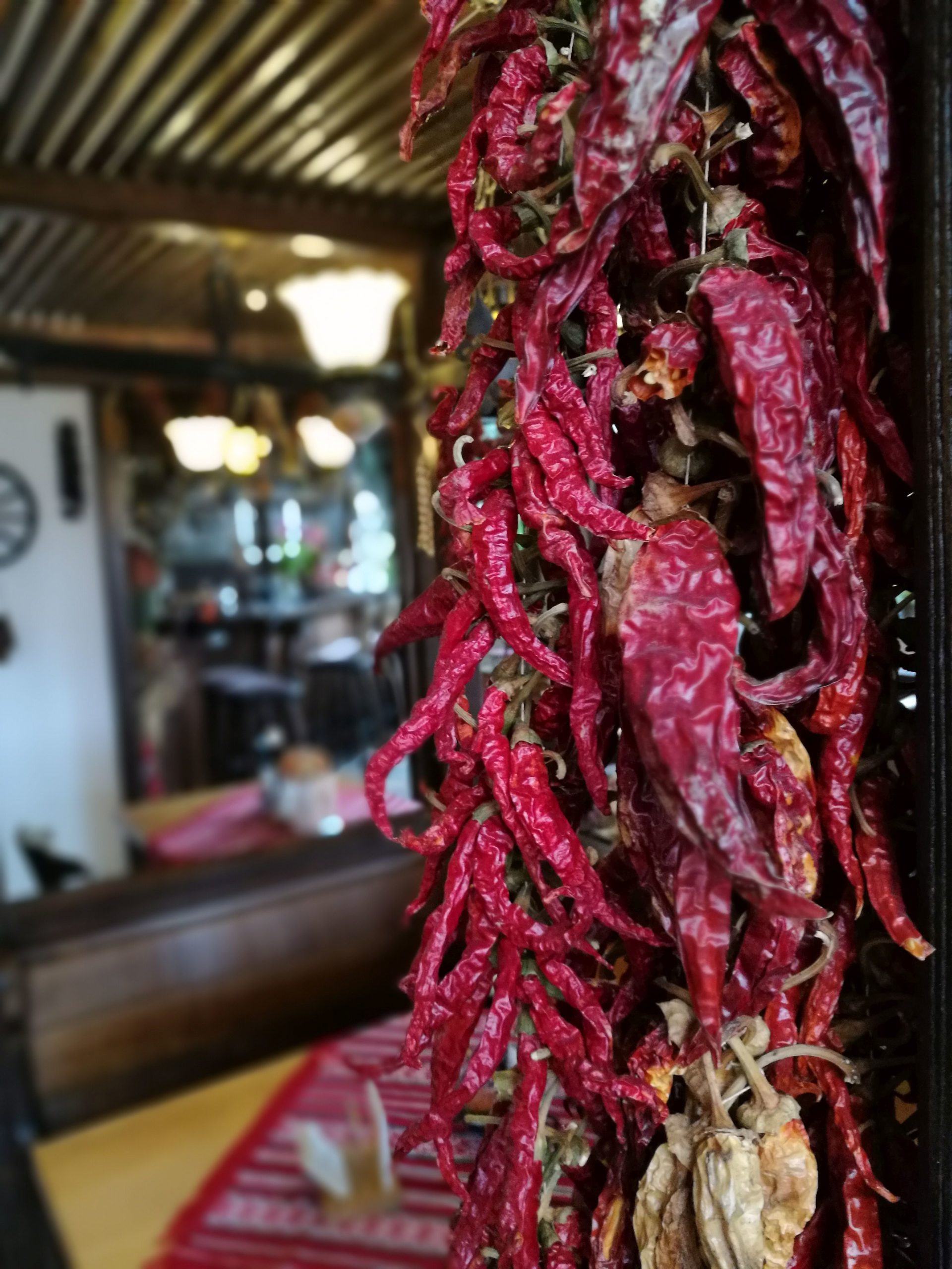 Diese typische ungarische Dekoration kennen wir alle. Die getrockneten Paprikaschoten sind der Touristen-Verkaufsschlager in ganz Ungarn. Wer sich ein Stück Ungarn mit nach Hause nehmen möchte, kauft sich diese Paprikaketten. Diese Deko haben wir gesehen in einem Berliner Restaurant.