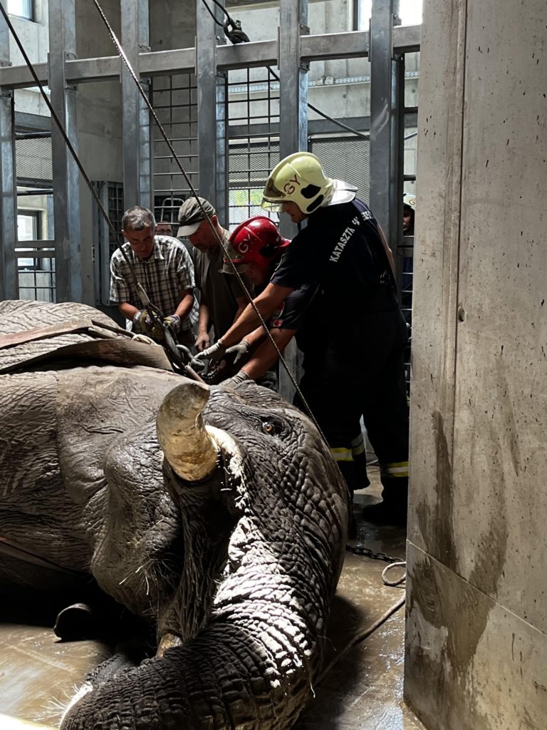 Das älteste, 22-jährige Mitglied der vierköpfigen Elefantenherde vom Zoo in Győr wurde am Sonntagmorgen von ungarischen Elefantenexperten und der Feuerwehr von Győr gerettet. Einige der Experten kamen aus Szeged und Veszprém, um Pembe zu helfen. Die Probleme begannen, als Pembe in einem unglücklichen engen Bereich im Inneren des Elefantenhauses zusammenbrach, aus der er nicht mehr aufstehen konnte. Die Rettung solch großer Tiere ist nicht nur mühsam, sondern braucht auch schnelles Eingreifen. Die ständige Belastung durch sein eigenes Gewicht kann die Lunge und verschiedene innere Organe des Tieres schädigen. In einer mehrstündigen, anstrengenden, aber erfolgreichen Rettungsaktion wurde der Kreislauf von Tierärzten aus Győr und Budapest unterstützt, und das sichere Anheben erfolgte unter der Leitung des Zoodirektors von Győr und Veszprém mit Unterstützung eines Teams der Feuerwehr von Győr. Das Wichtigste ist, dass es Pembe jetzt wieder gut geht. Stellt sich jedoch die Frage ob die Platzsituation vor Ort überhaupt artgerecht und für das Tier ausreichend ist.