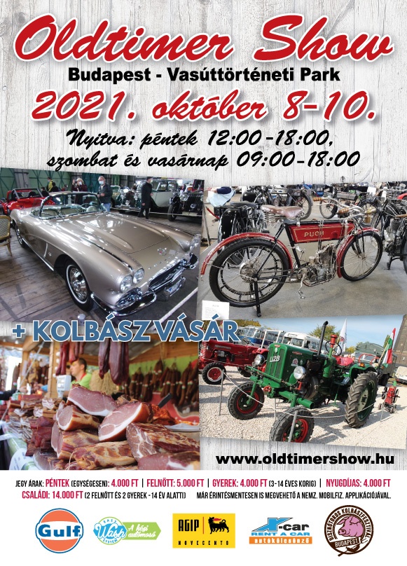 Vom 8. bis 10. Oktober erwartet die große Oldtimer Show im Bahnhistorischem Park Budapest alle Freunde der Retrofahrzeuge. Am Freitag öffnen die Tore um 12 bis 18 Uhr, Samstag und Sonntag kann man die Show von 9 bis 18 Uhr besuchen, Erwachsenen Tickets kosten am Freitag 4.000 HUF, an den anderen tagen 5.000 HUF.