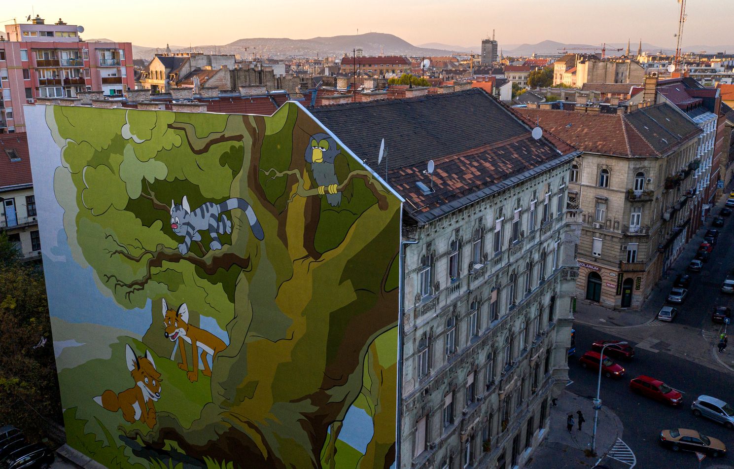 Die Vuk-Comicfiguren auf dem 800 Quadratmeter großen Wandgemälde wurden im VIII. Bezirk in der Baross Straße mühevoll aufgezeichnet. Es macht das Gebäude und die Gegen etwas farbenfroher.
