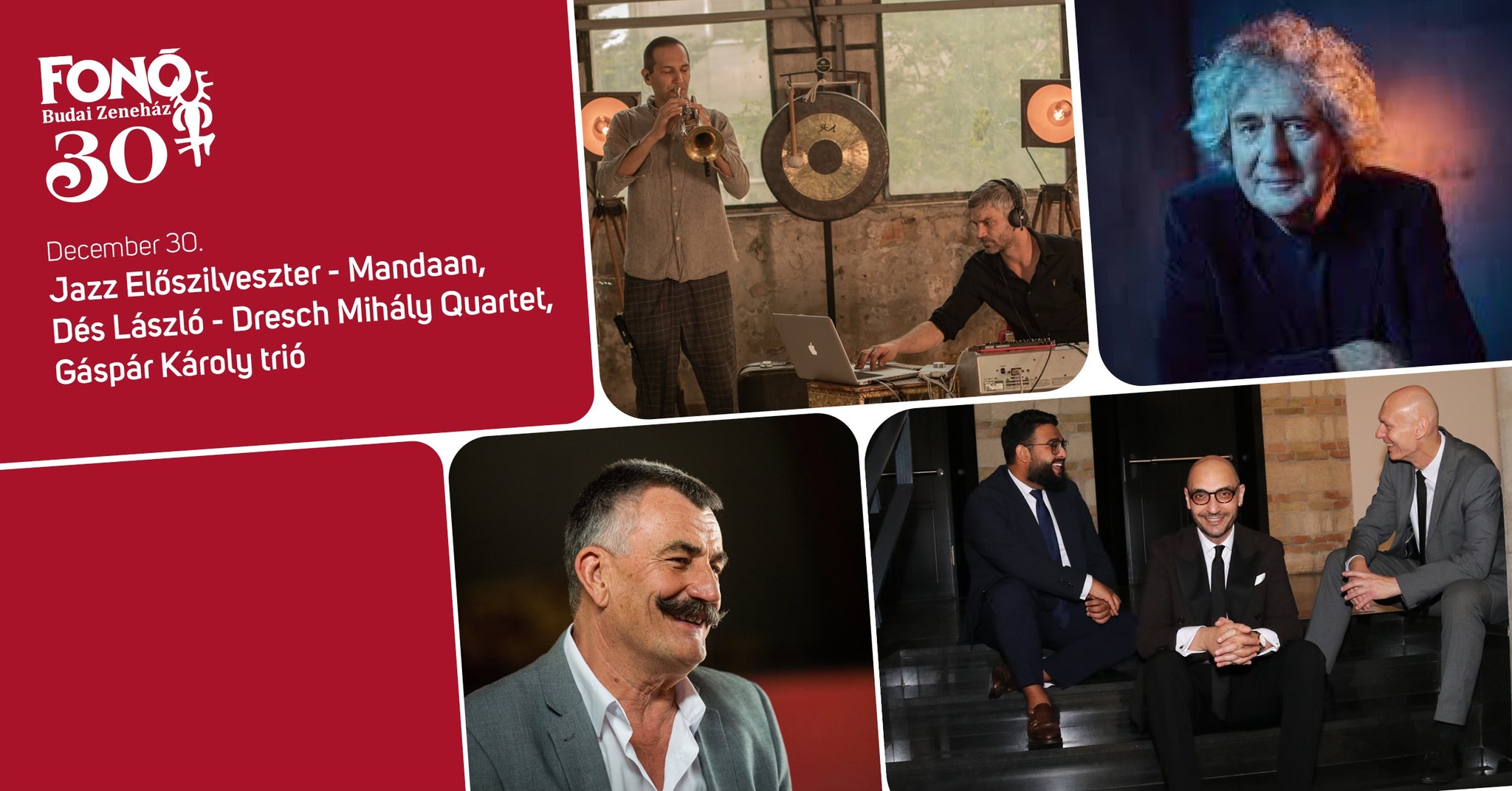 Der Jazz-Vorsilvesterabend am 30. Dezember präsentiert Künstler wie László Dés und das Mihály Dresch Quartett, das Károly Gáspár Trio und Mandaan. Beim Fonó Folk-Silvester wird das Publikum in das größte Silvester-Tanzhaus des Landes eingeladen.