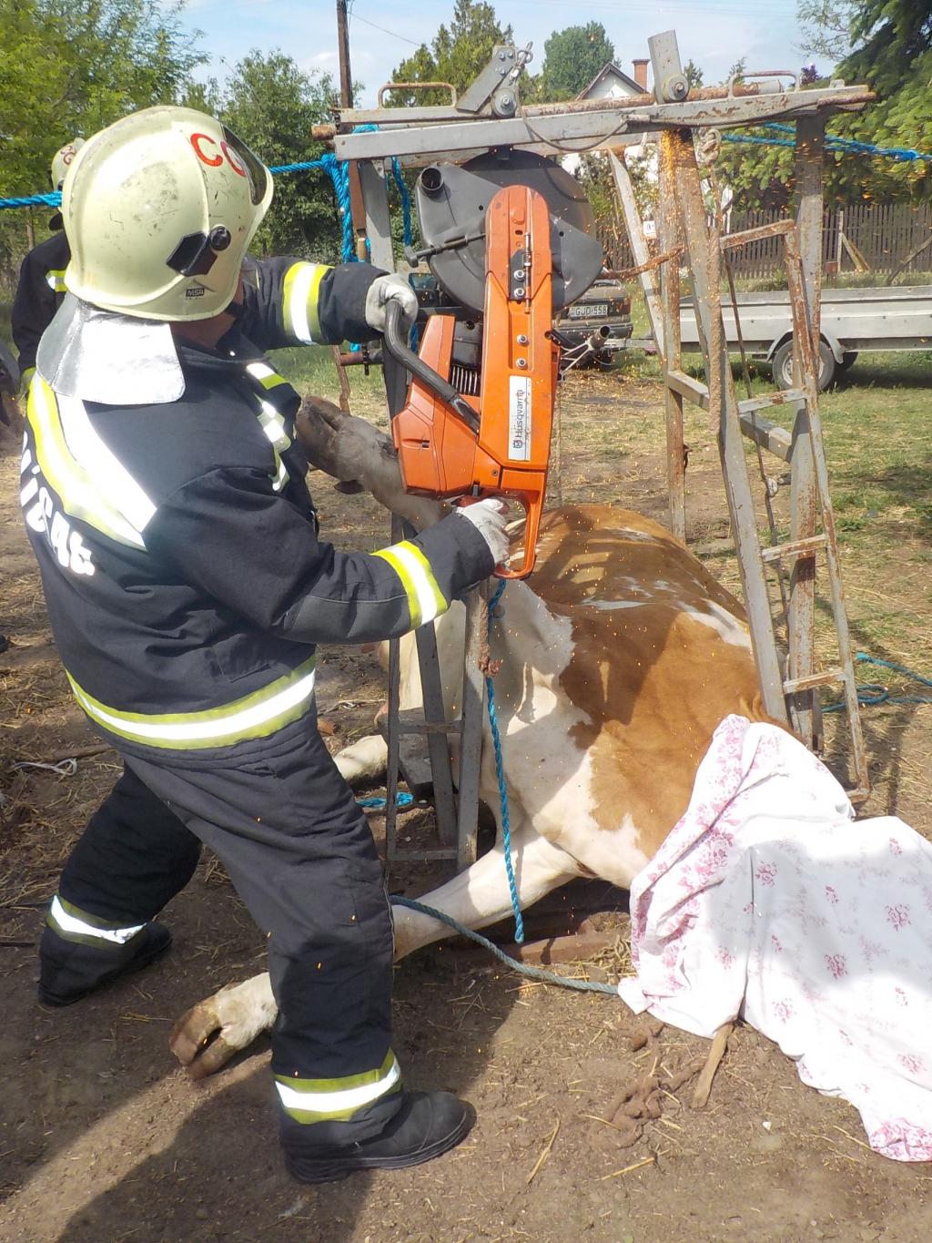 Eine Kuh brauchte die Hilfe des Katastrophenschutz Teams in Cegléd. Das Tier hatte die Beine in einem Eisenrahmen verfangen und hing komplett fest. Die Feuerwehr entfernten Teile der „Kuh-Fessel“ und befreiten so die Beine des Tieres. Nach der Rettung wurde die Kuh auf die Füße gestellt und unverletzt ihrem Besitzer übergeben. Gute Arbeit im Zeichen des Tierschutzes durch die Feuerwehr!