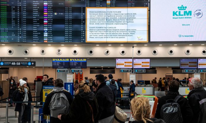 Grosse Fluginformationstafeln wurden am Terminal A des internationalen Flughafens Budapest Liszt Ferenc sei 10. März 2020 angezeigt. Aufgrund des Coronavirus haben Wizz Air und Ryanair Flüge nach Italien ausgesetzt. Ausserdem gibt Wizz Air die Aussetzung der Flüge nach Israel bekannt. Im Ankunftsbereich des Flughafens finden Gesundheitskontrollen verschiedener Passagiergruppen statt.