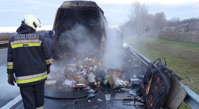 Auf der Autobahn M5 bei Kecskemét ist am Morgen Food-Truck Transporter komplett ausgebrannt. Der Transporter war auf dem weg von Rumänien nach Deutschland. Verletzt wurde glücklicherweise niemand. Die Feuerwehr löschte das Wrack ab und sperrte die Autobahn ab während der Löscharbeiten. der Transporter brannte komplett aus.