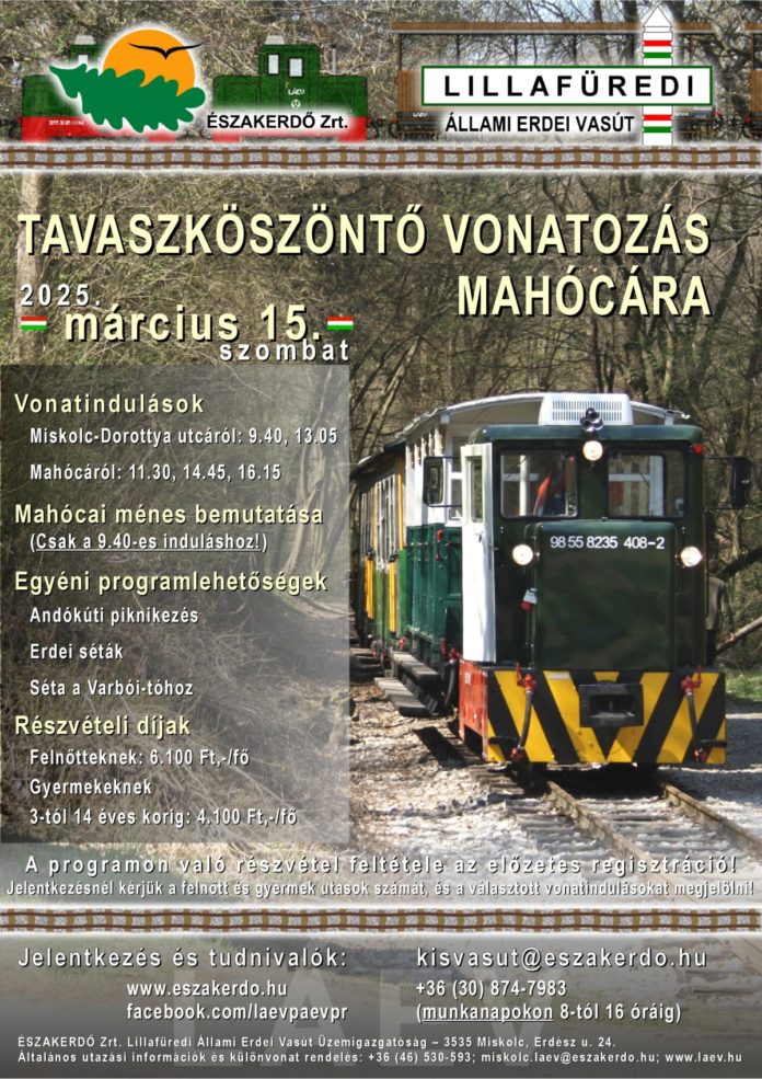 Am 15. März fährt im Rahmen einer Frühlingszugfahrt ein Sonderzug von Miskolc zur Mahóca-Nebenstrecke der Lillafüred Staatlichen Waldbahn, auf der regulär keine Züge verkehren.