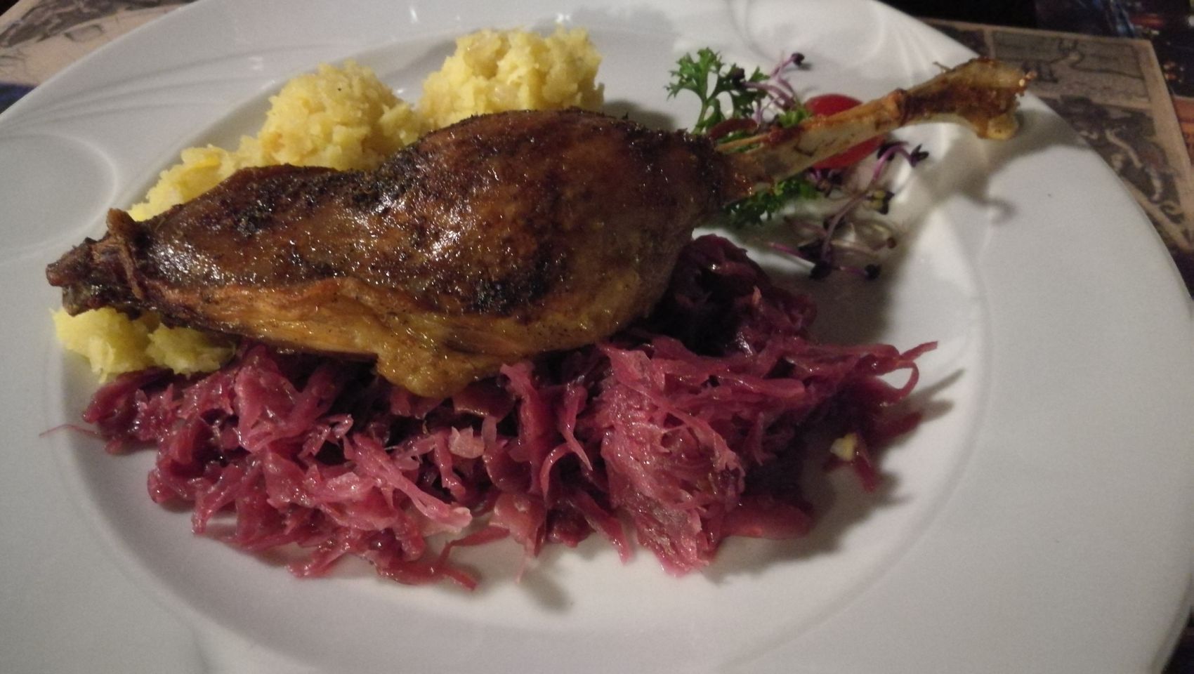 Im November ist Hauptgänsezeit auch in Ungarn. Gerne isst man auch in den Restaurants die Gänsekeule. Aussen schön knusprig und innen gut zart, so sollte sie sein. der typische Gänsegeschmack kommt auch oft durch die Sauce, die in manchen Restaurants leider zu kurz kommt.Wichtig ist das langsame Garen. Ist die Keule fertig, sollte sie natürlich mit Rotkohl, gebarenen Zwiebeln und Äpfeln serviert werden. wer also seine Novembergans noch nicht gegessen hat, sollte im Restaurant einen Tisch bestellen und noch die November-Angebote auf den Speisekarten nutzen.