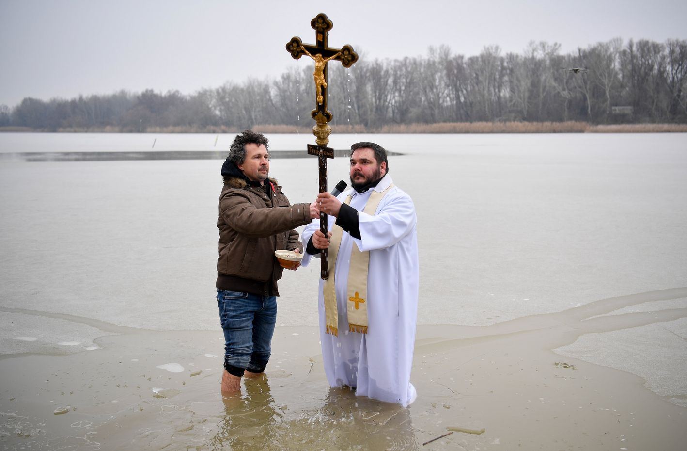 Kaplan Sándor Czókoly machte seine Füsse frei und watete ins noch teils zugefrorene Wasser des Theiss Sees. Er waltete seines Amtes und segnete den Theiß See bei der Dreikönigsveranstaltung am freien Strand von Tiszafüred am heutigen 8. Januar 2022. Neben ihm ist auch Ljasuk Dimitry, der Organisator der Veranstaltung ins Wasser gegangen um die Segung zu unterstützen.