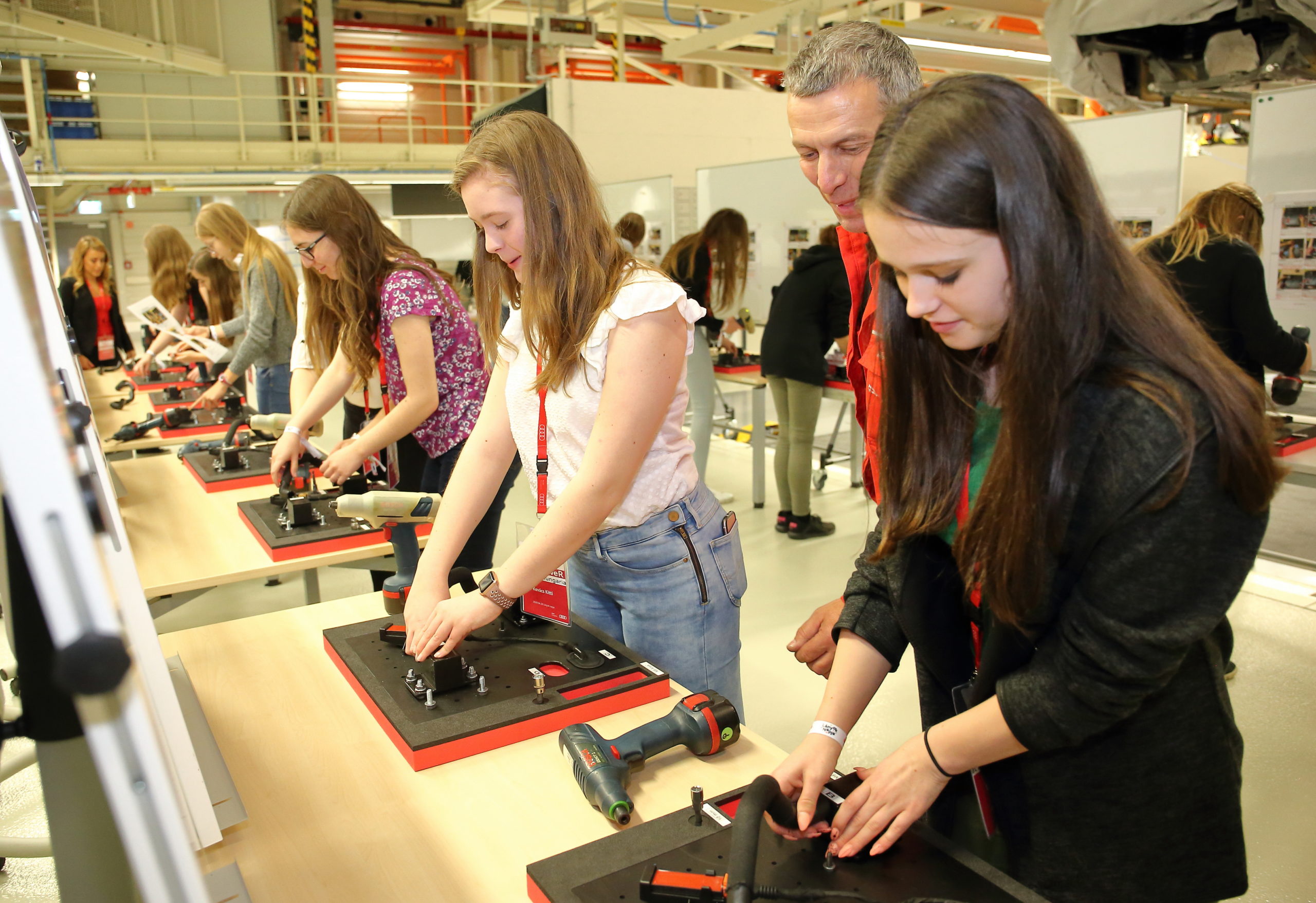 Im Rahmen des Programmes „Girls Day“ hatte Audi Hungaria rund 50 junge, vor der Berufswahl stehende Schülerinnen zu Gast. Ziel des Programmes ist es, bei Mädchen zwischen 14 und 18 Jahren technische Karrieremöglichkeiten attraktiv zu machen und ihnen bei der Berufsorientierung zu helfen. Die Teilnehmerinnen haben bei Audi Hungaria die Welt der Berufe in der Automobilindustrie im „Technischen Bastelraum“ hautnah erlebt, haben an einer Werkbesichtigung teilgenommen, Einblicke in die duale Ausbildung erhalten und sie wurden von Mitarbeiterinnen des Unternehmens im Rahmen von Round-Table Gespräche inspiriert.