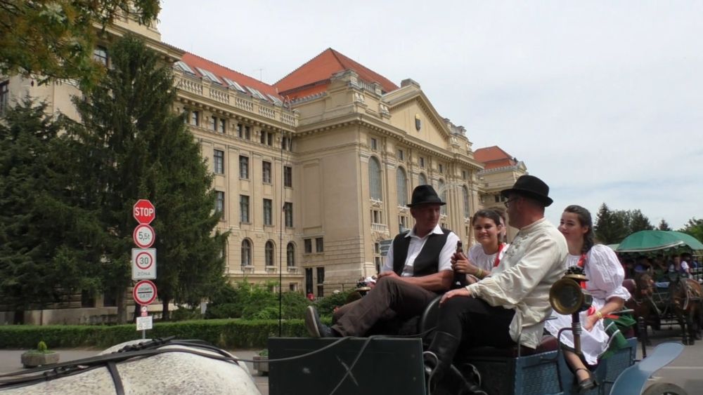 Zuerst sammeln sie sich vor dem größten und imposantesten Gebäude der Debreziner Universität . Dann schmücken sie sich in festlichen volkstümlichen Kleidernund in eleganten und geschmückten Kutschen ziehen sie singend von einem Gebäude der Uni zu dem anderen durch die Stadt, von Hussaren und Pferdehirten begleitet.