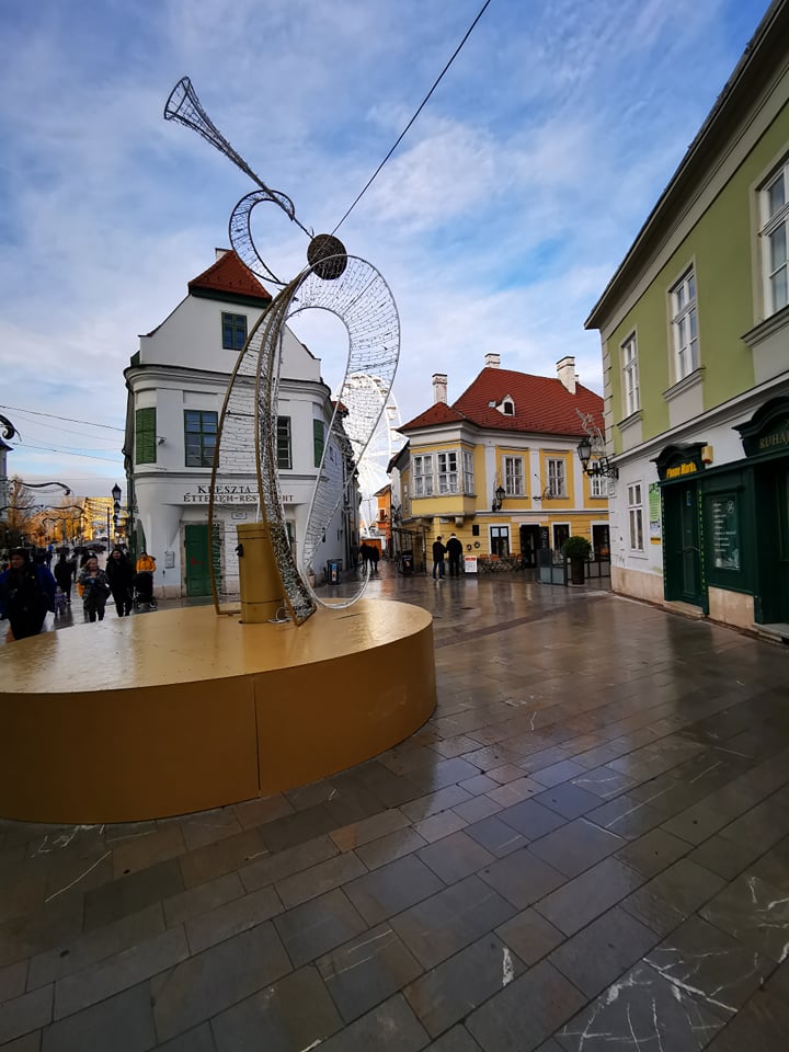 Auf dem Brunnen auf dem sonst die Sodawasserflasche Györs mit Wasser sprudelt, befindet sich jetzt ein Weihnachtsengel in moderner Kunst dargestellt. Schön anzusehen und schmückt die weihnachtliche Atmosphäre der Stadt.