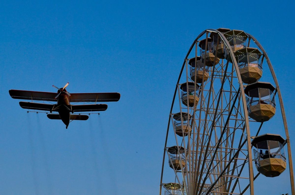 Ein wahrer Schnappschuß aus Hajdúszoboszló. Hier wird gerade aus dem alten Doppeldecker die Mückenbekämpfung durchgeführt als der Flieger unmkittelbar neben dem Riesenrad in Hajdúszoboszló fliegt. Ein netter Schnappschuß. Übrigens fliegen die Mückenbomber in mehreren ungarischen Städten zur Bekämpfung der Moskitos.