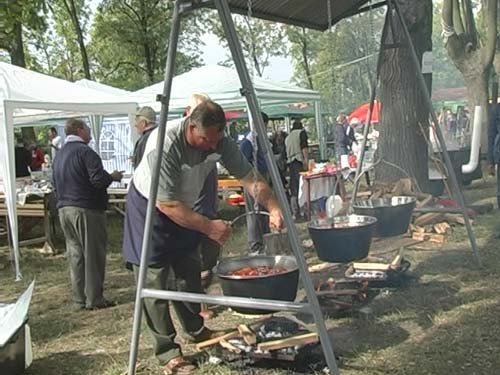 In den Kessel/Topf gieβen wir das Öl, geben wir den Speck und Fleckerln zu, rösten wir die, dann nehmen wir alle raus. Im zurückgebliebenen Fett bräunen wir die Zwiebeln, danach geben wir das rote Paprikapulver, die scharfe Kirschenpaprika und die Kartoffeln zu. Wir würzen das Ganze mit Pfeffer und gieβen mit so viel Wasser auf, damit es gerade bedeckt ist und rühren die Speise um.
