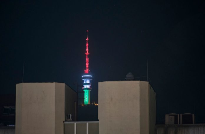 Bunter Fernsehturm in Pécs! Zu Ehren ihrer Arbeit während der Coronavirus-Epidemie wird der Fernsehturm in Pécs für Beschäftigte im Gesundheitswesen in Nationalfarben beleuchtet. Im Vordergrund steht die Klinik in der Lánc-Straße in Pécs.