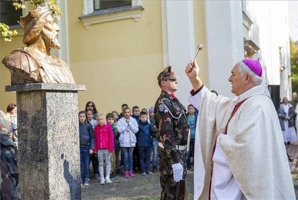 Der katholische Bischof László Bíró weiht die Statue des Heiligen Ladislaus (Szent László) am Tag der Übergabe in Hódmezővásárhely. Das Werk wurde vom Bildhauer Lantos Györgyi geschaffen. Ladislaus wurde 1048 geboren und war von 1077 bis zu seinem Tod 1095 König von Ungarn. Seine Regierungszeit stellte eine Phase des Friedens und der Beruhigung dar.