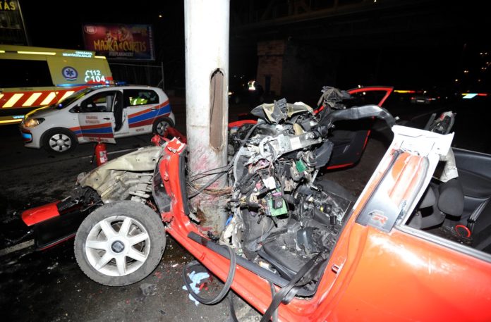 Wie durch ein Wunder haben zwei Personen in einem PKW diesen Aufprall gegen eine Ampel auf der Váci út in Budapest überlebt. Die beiden Personen wurden von der Feuerwehr aus dem total zerstörten Wrack gerettet. Der PKW muss mit hoher Geschwindigkeit gegen die Ampel gefahren sein und hat sich dann regelrecht um den Ampelmast gewickelt. Die beiden Insassen wurden schwer verletzt ins Krankenhaus gebracht.