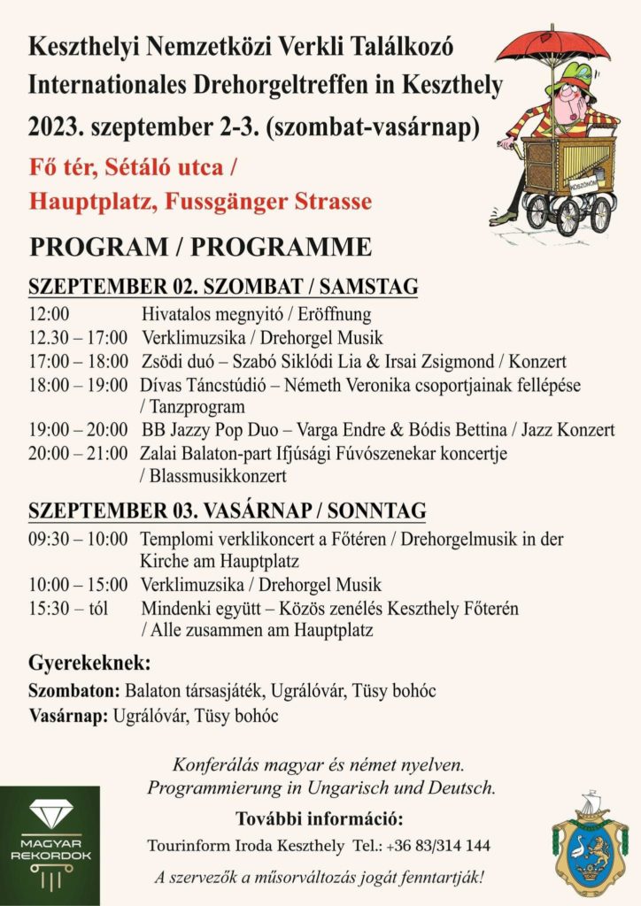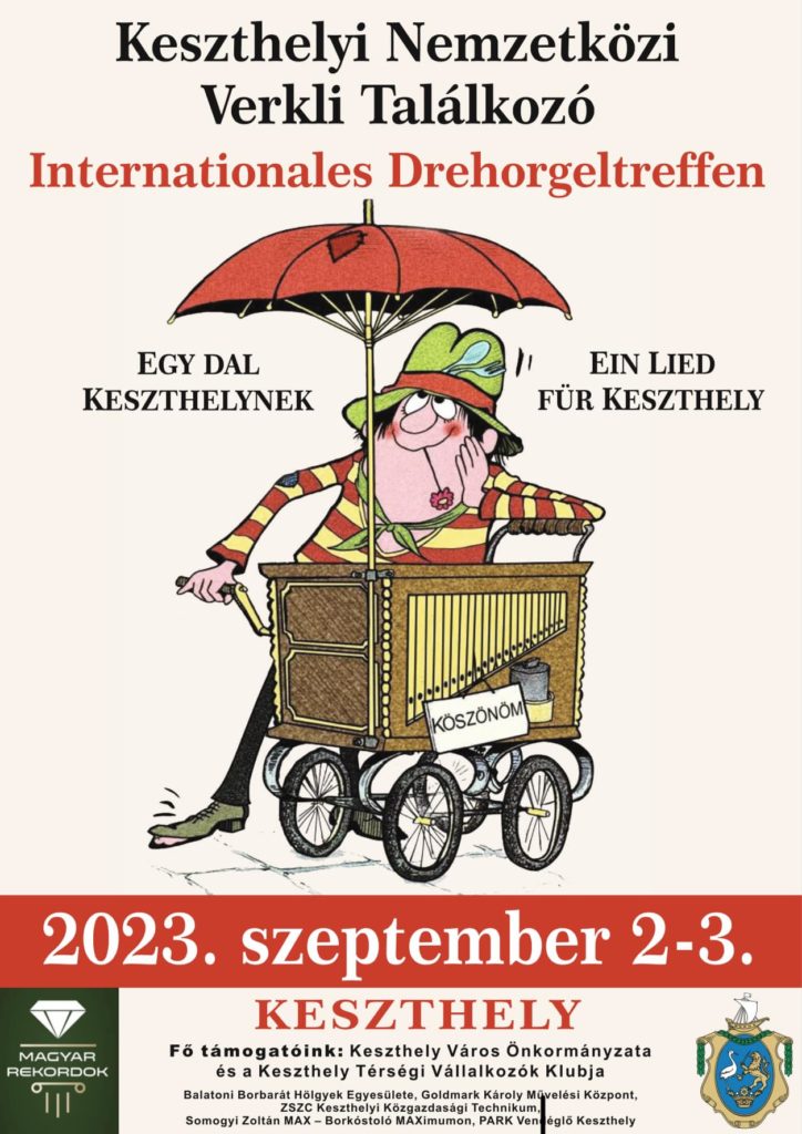 Das Internationale Drehorgelfestival in Keszthely findet dieses Jahr am 2. und 3. September statt. Die Musik erfüllt die Stadt mit Fröhlichkeit und der angenehmen Atmosphäre vergangener Zeiten. Einige der Drehorgelspieler bieten sogar kleine Vorführungen neben der Musik an, indem sie Puppenfiguren vor und auf den Orgeln bewegen. Das Festivalprogramm wird durch Volkstänzer, Konzerte und verschiedene Verkaufsstände bereichert. Dieses einzigartige Festival in Ungarn, das von dem aus der Schweiz stammendem Ehepaar Irina und Hansjörg Surber ins Leben gerufen wurde, die derzeit in Gyenesdiás leben, hat sich im Laufe des letzten Jahrzehnts durch die Präsentation der Kultur und des Geistes von Musikinstrumenten aus der Jahrhundertwende in ganz Europa Popularität und Anerkennung erworben. Jahr für Jahr unterstützt eine Reihe internationaler Teilnehmer die Präsentation des Lebens und Werks ehemaliger Drehorgelspieler, neben ungarischen Teilnehmern. Teilnehmer aus Nachbarländern haben sich in erheblicher Anzahl für das internationale Ereignis angemeldet, das vor sechs Jahren die ungarische Rekordqualifikation erlangte, darunter Drehorgelspieler aus Slowenien, der Slowakei, Ungarn, Österreich, Deutschland, der Schweiz und den Niederlanden, die das Publikum in Keszthely während des ersten Septemberwochenendes unterhalten werden. Bei der diesjährigen Veranstaltung haben sich mehr als 70 internationale Drehorgelspieler mit rund 55 Instrumenten angemeldet. Das Internationale Drehorgelfestival heißt seine Besucher nun schon seit 10 Jahren auf Keszthelys Hauptplatz, dem Markt, der Promenade und im Schlosspark willkommen.