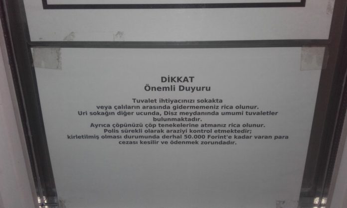 Auf (und nur) Türkisch wird darauf hingewiesen, dass man den Bereich vor der Botschaft nicht als Toilette benutzen darf, da sonst ein Platzverweis erfolgt. Öffentliche Toiletten befänden sich am Dísz tér, wo man seinen Müll auch in entsprechenden Tonnen entsorgen könne. Die ungarische Polizei kontrolliere das ständig, bei Zuwiderhandlungen werden Geldstrafen von bis zu 50.000 Forint sofort verhängt und vollstreckt.