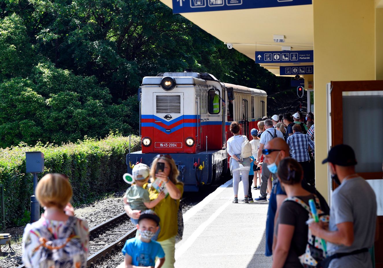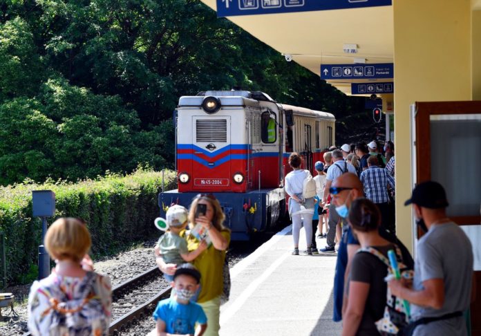 Zahlreiche Fahrgäste am Bahnhof Hűvösvölgy am Wochenende. Aufgrund der Einschränkungen während der Coronavirus-Epidemie wurde der Verkehr auf der Széchenyi-hegy-Kinderbahn nach fast sieben Monaten Stillstand am 3. Juni wieder aufgenommen. Im Sommer verkehren die Züge nun wieder täglich: Jede Stunde an Wochentagen und alle 40-50 Minuten am Wochenende. Besonders Wanderer sind in der schönen Umgebung willkommen.