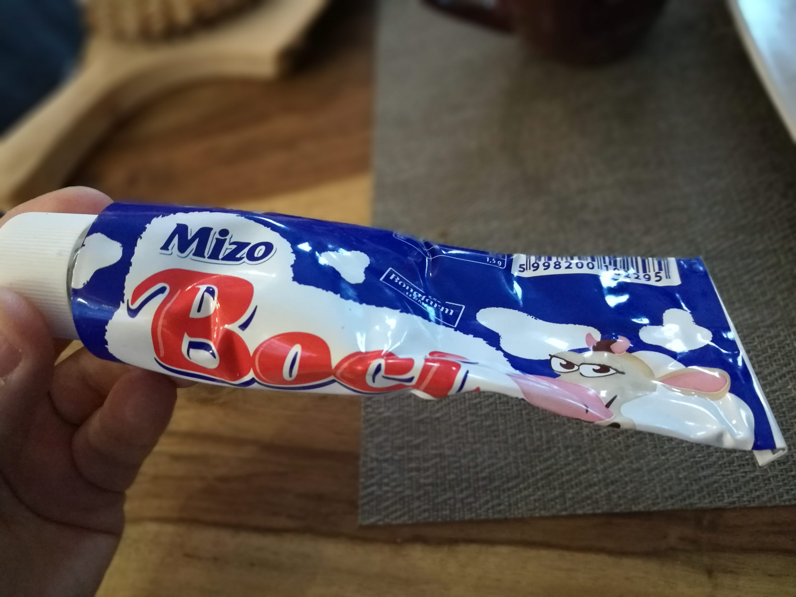 Es sieht aus wie ein Zahnpaste…Drin ist jedoch: Frischkäse. Der leckere Frischkäse von Mizo mit dem Namen „Boci“ (Boci — Kälbchen) isst man in Ungarn auch gerne aus der Tube.