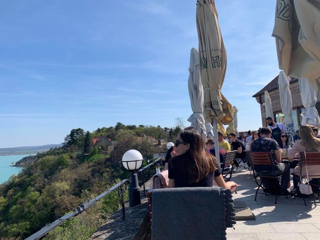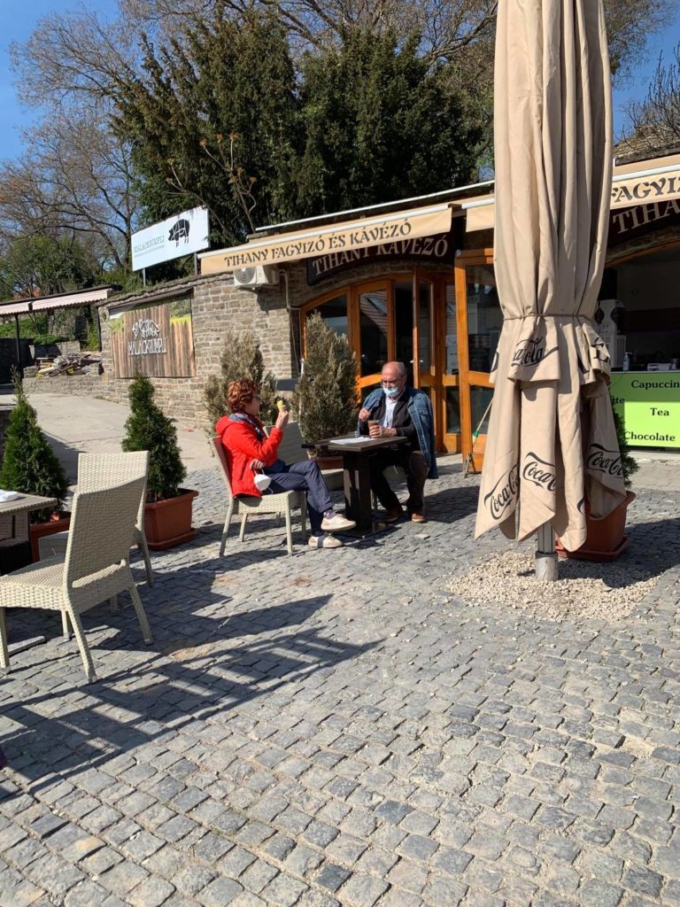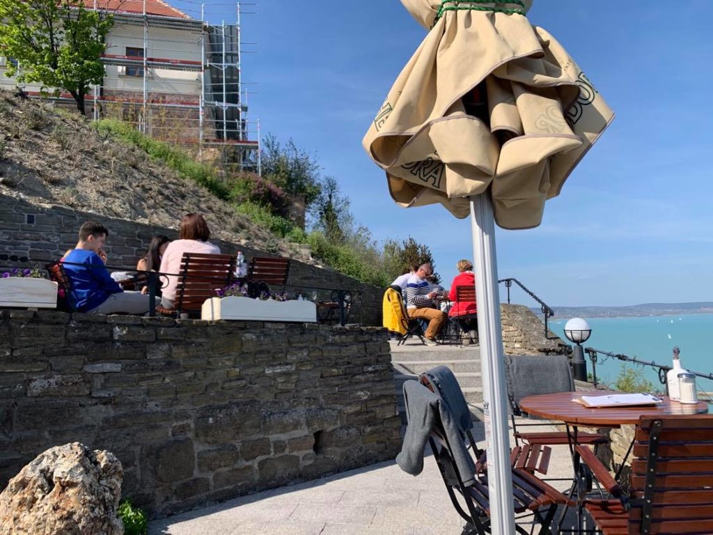 Der Balaton zeigt sich heute von seiner besten Seite. Karibische Farben im Wasser, blauer Himmel und der Sonnenplanet strahlt mit ganzer Kraft. Und gerade an einem solchen Tag am Wochenende dürfen die Restaurants und Cafés ihre Terassen öffnen. Für viele Ausflügler also ein doppeltes Geschenk an diesem ersten Wochenendtag. In Tihany hatte man einige wunderschöne Gelegenheiten das Wetter und das Ambiente zu geniessen. Heute alles noch in ganz entspannter Situation. Kein übermässiger Andrang, ordentlich Platz und extrem lockere und fröhliche Stimmung bei allen.