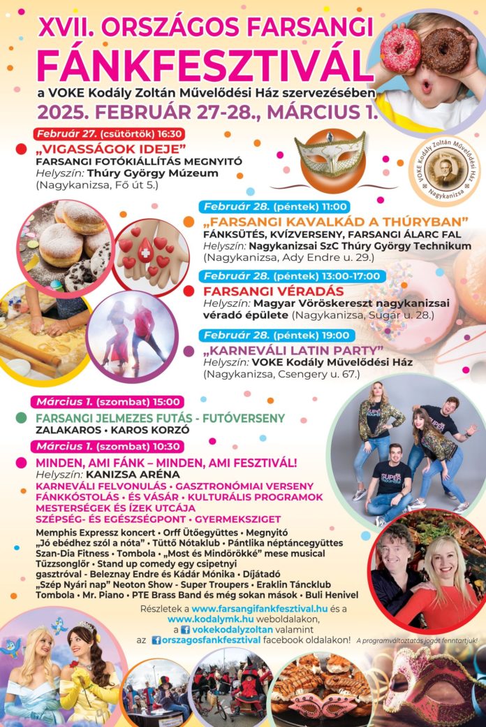 Den Auftakt der Veranstaltungen bildet am 27. Februar die Eröffnung einer Faschings-Fotoausstellung mit dem Titel „Zeit der Fröhlichkeit“ im Thúry György Museum, die eine Auswahl aus dem volkskundlichen Fotoarchiv des Museums zeigt. Am nächsten Tag erwartet das Thúry György Technikum des Berufsbildungszentrums Nagykanizsa die Besucher mit Krapfenbacken und einem Quizwettbewerb, während das Kodály Kulturhaus eine karnevalistische Latin-Party veranstaltet.
