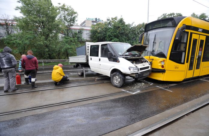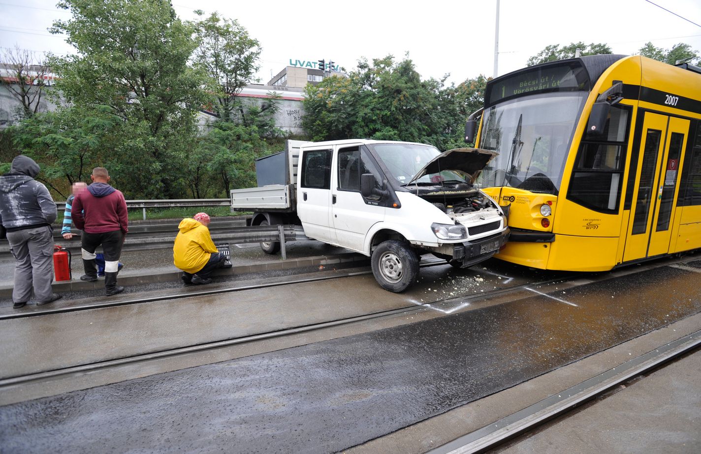 GeradeBeschädigter LKW und Straßenbahn in XI. Bezirk auf Szerémi út, wo das Fahrzeug über die Fahrspurbarriere fuhr und am 25. Juli 2020 mit der Straßenbahn 1 kollidierte. Bei dem Unfall wurde niemand verletzt.
