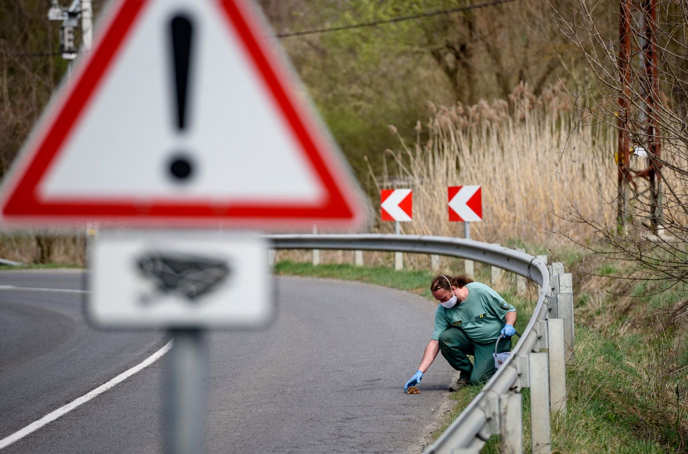 István Lantos, der Naturschutzbeauftragte der Direktion des Bükk-Nationalparks, hilft mit seinem Team den braunen Kröten über die Straße wie hier auf dem Bild zu sehen in der Nähe der Siedlung Zagyvaróna in Salgótarján. Jedes Frühjahr brechen die Kröten aus ihren unterirdischen Überwinterungsgebieten in großen Herden zu ihren Brutgebieten in Richtung eines nahe gelegenen Sees auf. Naturschützer helfen den Fröschen, die Straße zu überqueren. Schilder weisen derzeit in vielen Gebieten Ungarns auf die Krötenwanderung hin.