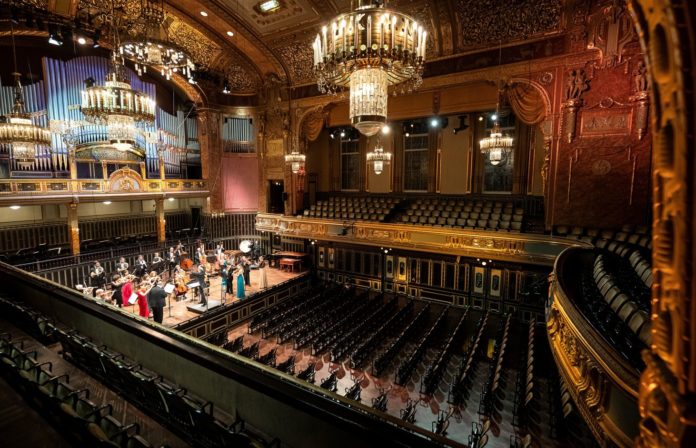 Leere Stühle im Danubia-Orchester von Óbuda beim Konzert von Kurtág / Haydn / Dvořák in der Großen Halle der Musikakademie am 13. März 2020. Das Konzert hinter verschlossenen Türen aufgrund der Bedrohung durch das Coronavirus wurde live auf Online-Plattformen übertragen.