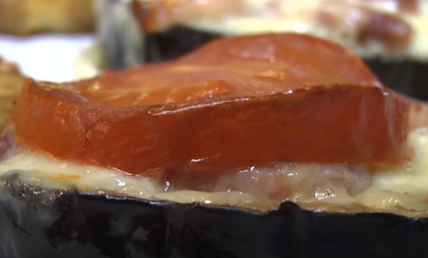 Salz daraufgeben, etwas Olivenöl auf die Auberginenscheiben geben, Bacon in Würfel geschnitten auflegen, Mozzarella Käse auflegen und 1-2 Tomatenscheiben oben auflegen.