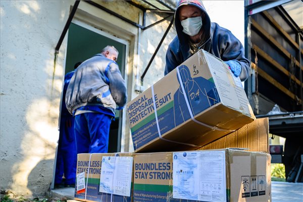 Mehrere Gesundheitsschutzausrüstungen wurden am 31. März 2020 im Lungenmedizinischen Institut des Landkreises Veszprém in Farkasgyepű entladen. Die Lieferung enthält viertausend chirurgische Gesichtsmasken, sechshundert FFP2-Schutzmasken, zwanzigtausend Untersuchungshandschuhe, einhundert Overalls, fünfhundert Papieroveralls, dreihundert Schutzbrillen, neunhundert Akkordeonmützen und zweitausend Fußschutz.