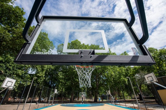 Hier sieht man den Basketballplatz in der 2. Phase der Entwicklung des Liget-Parks in Budapest der in Városliget fertiggestellt wird. In der zweiten Phase der Garten- und Landschaftsrenovierung, die im Herbst abgeschlossen sein wird, werden Garten- und Landschaftsrenovierung mit multifunktionalen Sportfeldern, einer Laufbahn, einem Offroad-Spielplatz, einem weiteren Hundeabenteuerpark, einer Promenade und einem erneuerten botanischen Garten angereichert.