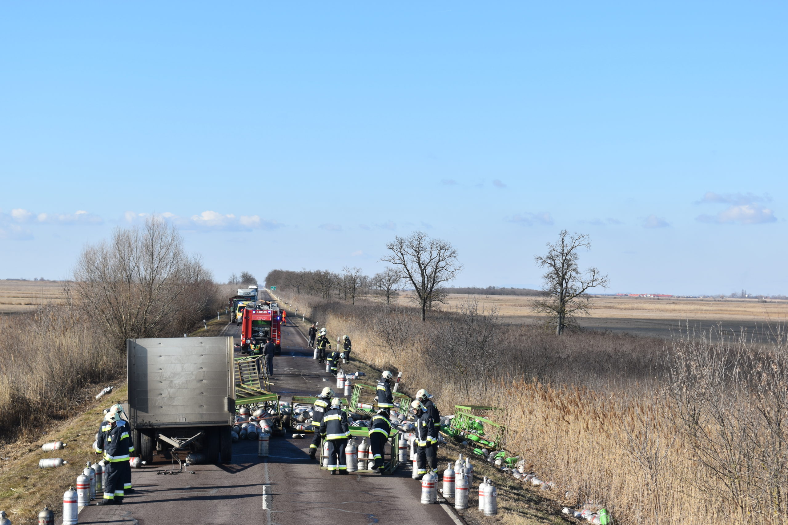 Der Anhänger eines Lastwagens mit Gasflaschen kippte in der Nähe der Hauptstraße 33, Hortobágy, aus bisher nicht geklärter Ursache um. Von der Ladung des Lastwagens – von mehr als 800 Flaschen – wurden 400 beschädigt und 5 entzündet, die von den ersten Einsatzkräften mit einem Pulverlöscher gelöscht wurden. Die Berufsfeuerwehren von Tiszafüred, Debrecen und Hajdúszoboszló sowie die städtischen Feuerwehren von Balmazújváros waren unter der Leitung des Katastrophenmanagement-Einsatzdienstes des Landkreises Hajdú-Bihar im Einsatz.