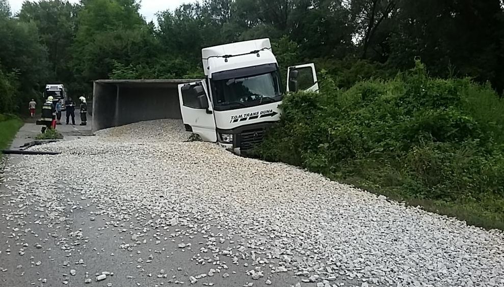 Der Anhänger eines Lastwagens kippte am Nachmittag auf der Straße zwischen Lábatlan und Bajót um. Die Ladung des Lastwagens – 26 Tonnen Schotter – verteilte sich auf die Straße. Die Feuerwehrvon Nyergesújfalu, trennten die Zugmaschine vom Anhänger und beseitigten die Verkehrsbehinderung gemeinsam mit einem Bergungsunternehmen. Zum Zeitpunkt der Bergung war eine vollständige Straßensperre in Kraft. Der Fahrer des LKWs kam mit dem Schrecken davon. Wie der Anhänger umkippen konnte ist noch unklar.