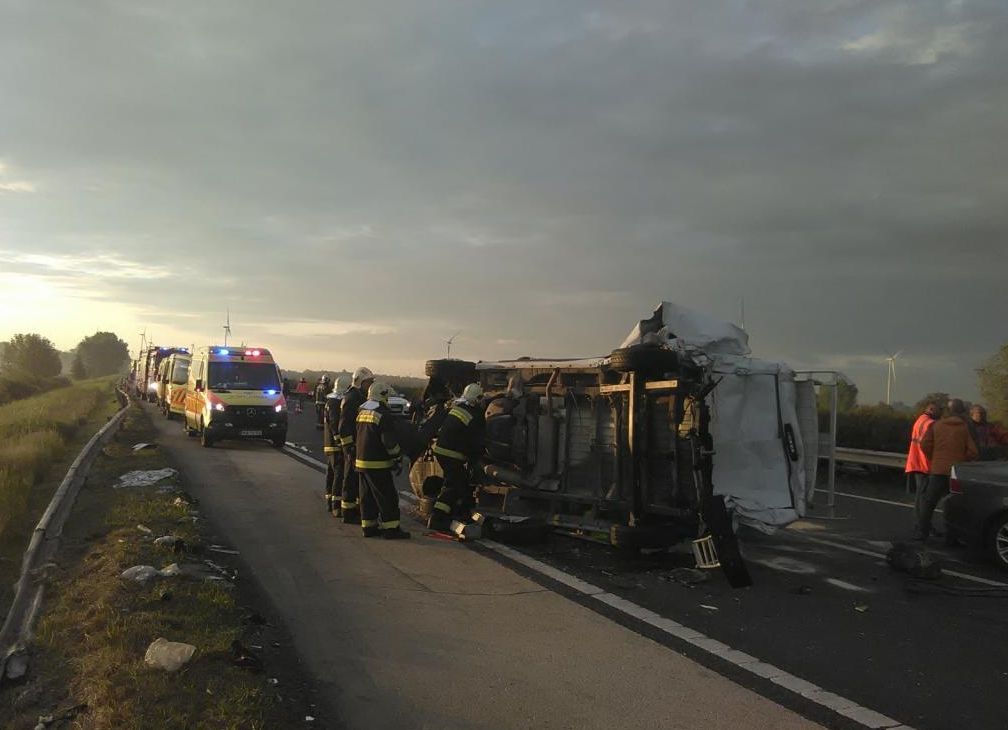 Am frühen Morgen ist aus bisher ungeklärten Gründen ein LKW auf der M1 Höhe Komarom Richtung Györ ins Schleudern geraten und umgekippt. Zahlreiche (7) weitere Fahrzeuge fuhren in die Unfallstelle und kollidierten ebenfalls miteinander. Die Feuerwehr musste den LKW Fahrer aus dem Wrack befreien. Er wurde mit schweren Verletzungen ins Krankenhaus gebracht. Weitere Unfallteilnehmer mussten ebenfalls verletzt ins Krankenhaus gebracht werden. Der Autobahnabschnitt war mehrere Stunden in Fahrtrichtung Györ voll gesperrt.