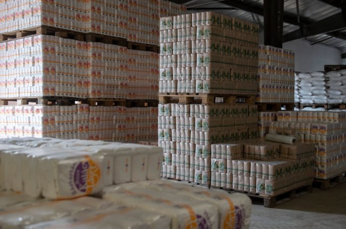 Aufgrund der hohen Anfrage nach Mehl im ganzen Land fahren die Mühlen Sonderschichten derzeit. So wie hier die Mühle Egri Malom Zrt. läuft der Betrieb auch am Wochenende durch. Die Lager sind aktuell gut gefüllt mit der begehrten Ware in Ungarn. Palettenweise türmen sich die Mehlpackungen nach der Sonderschicht im Mühlenlager.