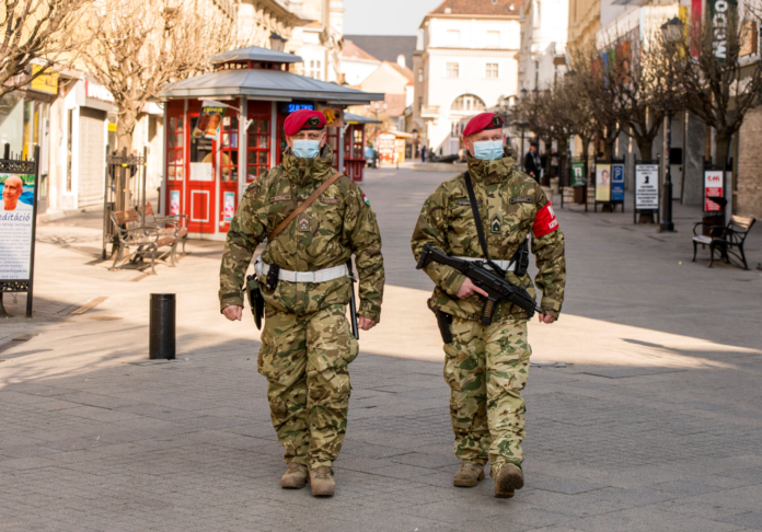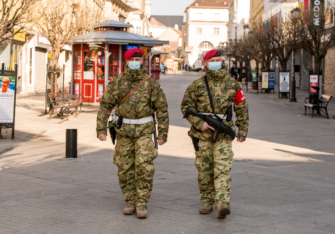 Soldaten des 12. Arrabona Luftverteidigungs-Raketenregiments patrouillieren in der Innenstadt von Győr. Der Zweck ihrer Präsenz auf der Straße besteht darin, die Aufrechterhaltung der öffentlichen Sicherheit und Ordnung zu unterstützen und das Vertrauen der Bevölkerung während der Coronavirus-Epidemie zu stärken.