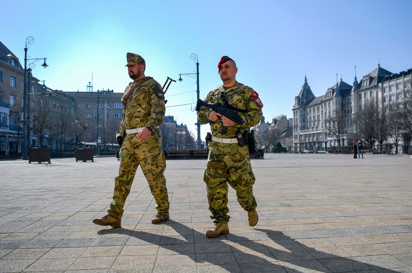 Ein Bild welches Angst macht. Militärpatrouillen auf dem Kossuth-Platz in Debrecen am 20. März 2020. Der Zweck der Präsenz der Soldaten auf der Straße besteht darin, die Aufrechterhaltung der öffentlichen Sicherheit und Ordnung zu unterstützen und das Vertrauen der Bevölkerung während der Coronarepidemie zu stärken. Die Militärpräsenz wurde in dieser Woche entschieden und angeordnet. Ausserdem hat man in zahlreiche Firmen (speziell Lebensmittel und Pharma) sogenannte Kontrollorgane des Militärs platziert um im Notfall die Versorgung mit lebensnotwendigen Dingen zu garantieren.